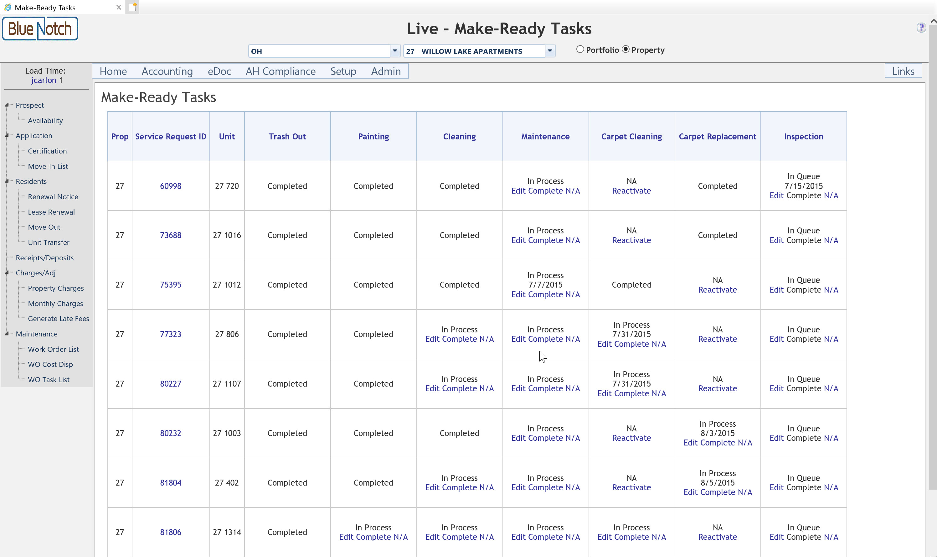 Blue Notch allows for the creation and tracking of service requests including automatic "Make Ready" work orders upon moveout.